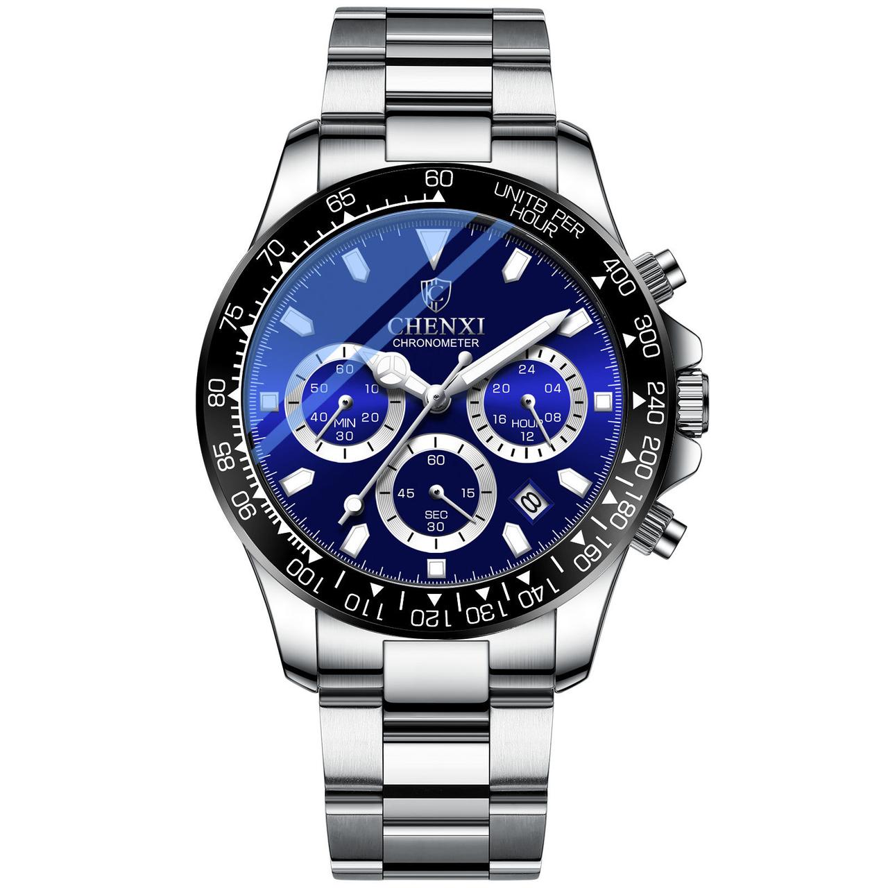Часы Chenxi CX-908 мужские кварцевые 4 циферблата и календарь застежка бабочка с безелем Серебро с синим