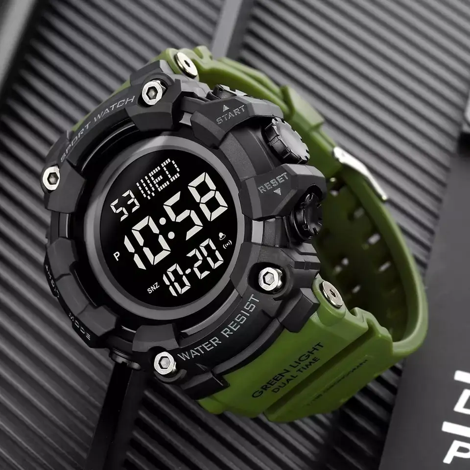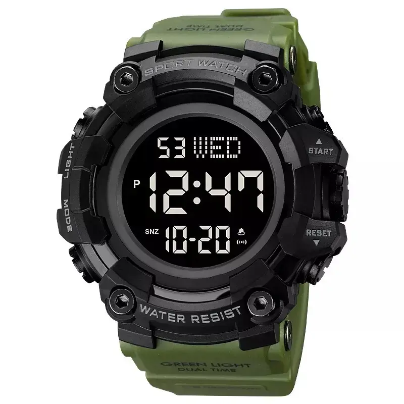 Тактические часы Skmei 1968 Зеленый – ваш верный спутник в мире активных приключений. Эти часы созданы для мужчин, которые ставят надежность и точность на первое место. С электронной начинкой и прочным поликарбонатным стеклом, вы можете быть уверены, что они выдержат любые испытания. Они имеют водонепроницаемость до 3 метров, что делает их идеальными как для повседневного ношения, так и для экстремальных условий.