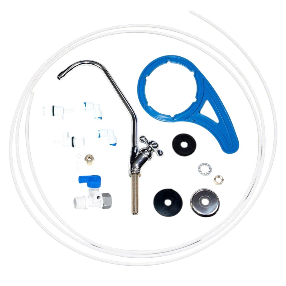 Установка фильтра производится под мойкой, с подключением к водопроводу. Диаметр присоединительной резьбы — ½ дюйма. В комплекте вы найдете отдельный кран для очищенной воды и все необходимые детали для монтажа и эксплуатации. Фильтр рассчитан на использование 10-дюймовых картриджей.