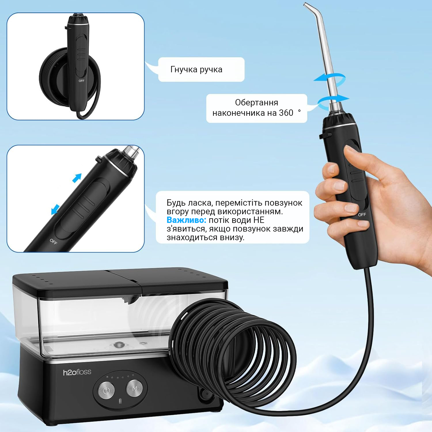 Ирригатор H2OFloss HF-3pro Black — это ваш идеальный помощник для поддержания идеальной гигиены рта. С этим оригинальным устройством вы забудете о проблемах с зубным налетом и загрязнениями. Ирригатор обеспечивает деликатную и бережную очистку всей полости рта, создавая мощный пульсирующий поток воды, который effortlessly очищает даже самые труднодоступные места.