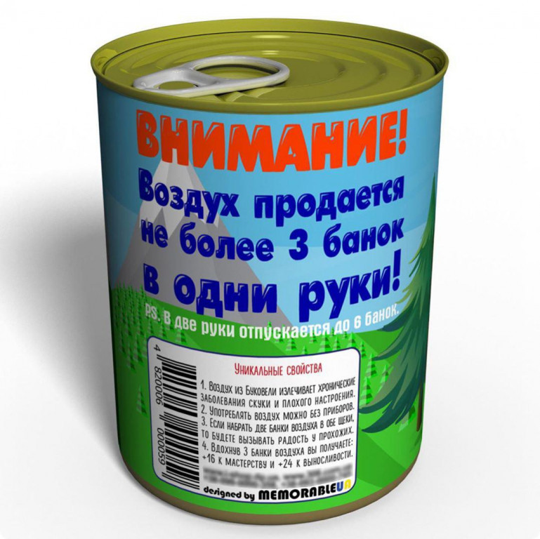 Не упустите возможность подарить себе или близким консервированный воздух Буковели — это не просто сувенир, а настоящее дыхание гор! Заказывайте прямо сейчас и наполняйтесь радостью!»