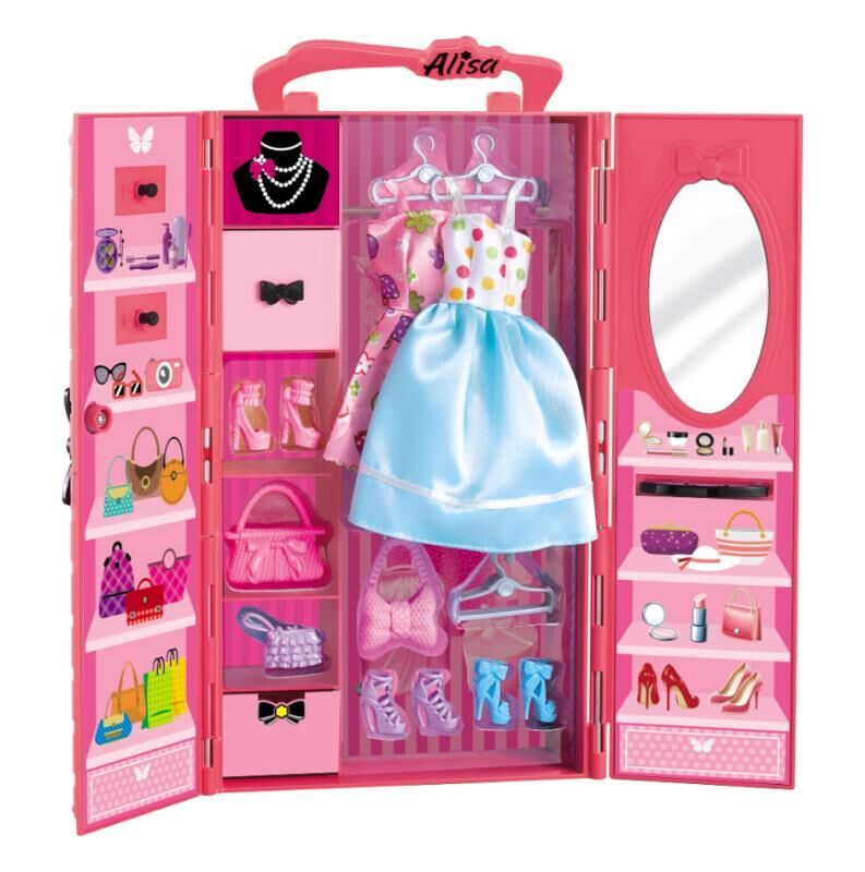 | Артикул127801 | Габариты31 x 18.5 x 7 см | Комплект поставкишкаф с полочками и зеркалом, 2 платья для куклы, 3 пары туфель, 3 сумочки, 6 тремпелей |