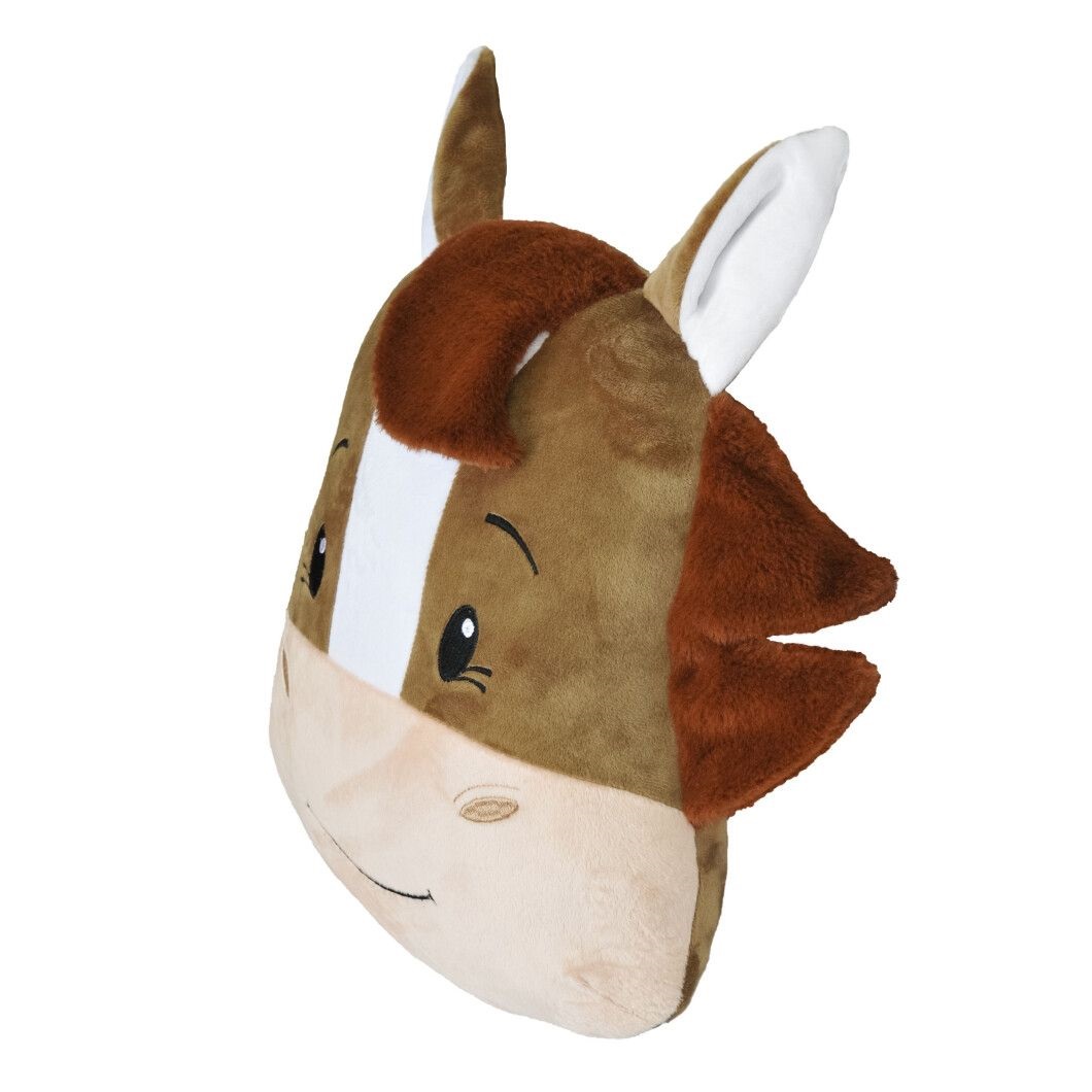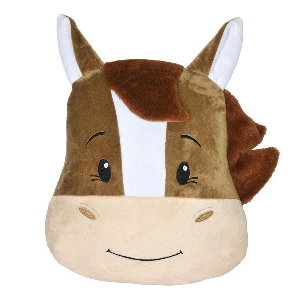 Подушка имеет форму волшебной мордашки лошадки с большими добрыми глазами, нежной улыбкой и пушистой челкой, что придает изделию особый шарм и игривость.