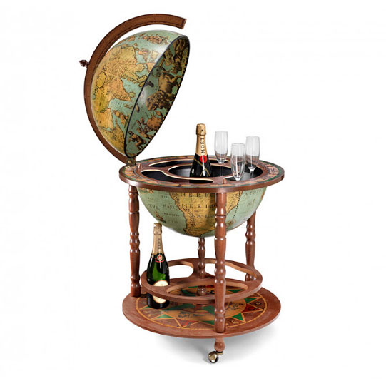Барное отделение удобно вмещает до 6 винных бокалов и одну бутылку. Под глобусом вам доступна полка с держателем, что позволяет размещать необходимые аксессуары под рукой. Колесики, на которых установлен глобус, облегчают его перемещение и позволяют легко менять местоположение бара в вашем интерьере.