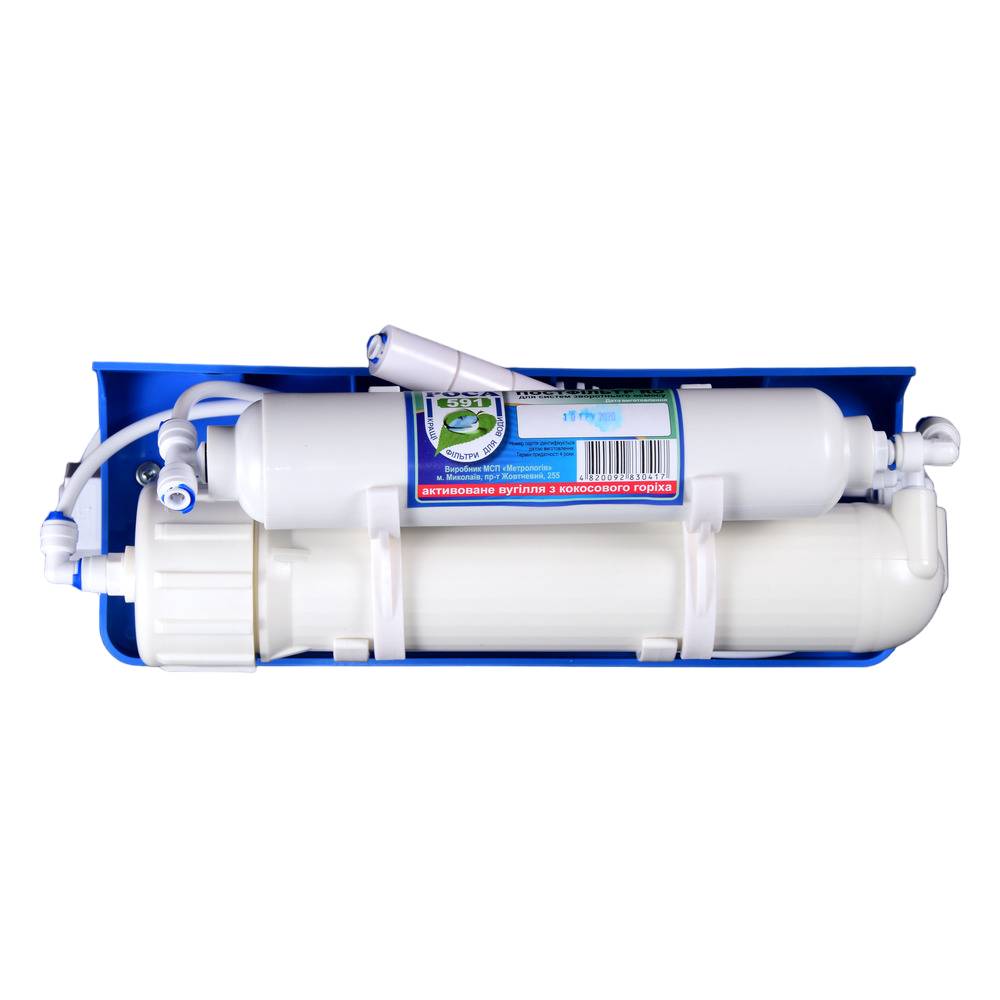| Этапы очистки | Картридж из вспененного полипропилена 20 мкм Картридж из гранулированного активированного угля из скорлупы кокосовых орехов Картридж из вспененного полипропилена 1 мкм Мембрана 50 GPD (190 литров в сутки) Угольный постфильтр |