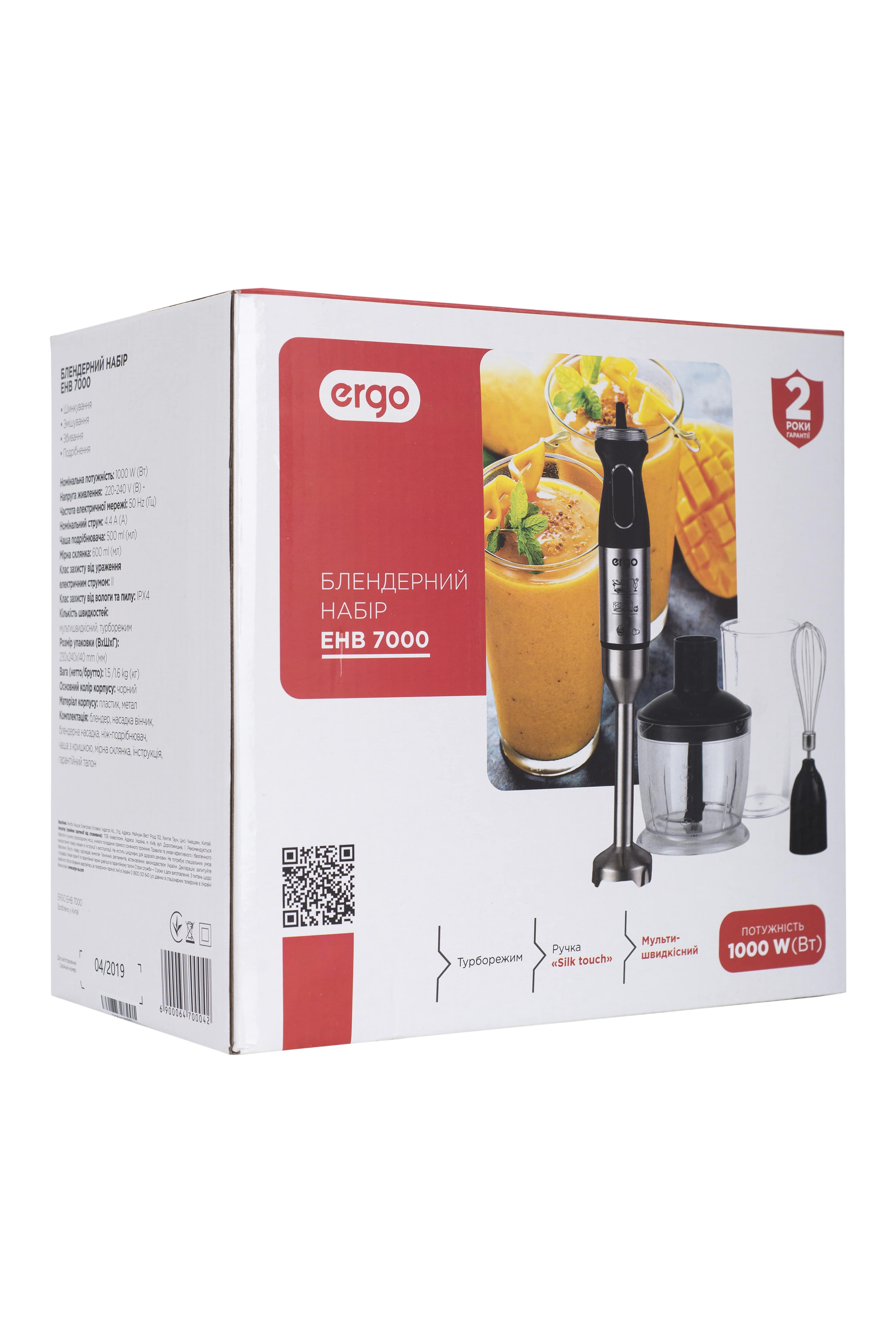 Міцність ERGO EHB 7000 становить 1000 Вт, що дозволяє змішувати або подрібнювати різноманітні продукти за лічені секунди. Прилад не займає багато місця і важить всього 1.6 кг. Оптимальний розмір чаші у 500 мл та вимірювальної ємності у 600 мл дозволяє використовувати кількість продуктів, достатню для приготування їжі для всієї родини.