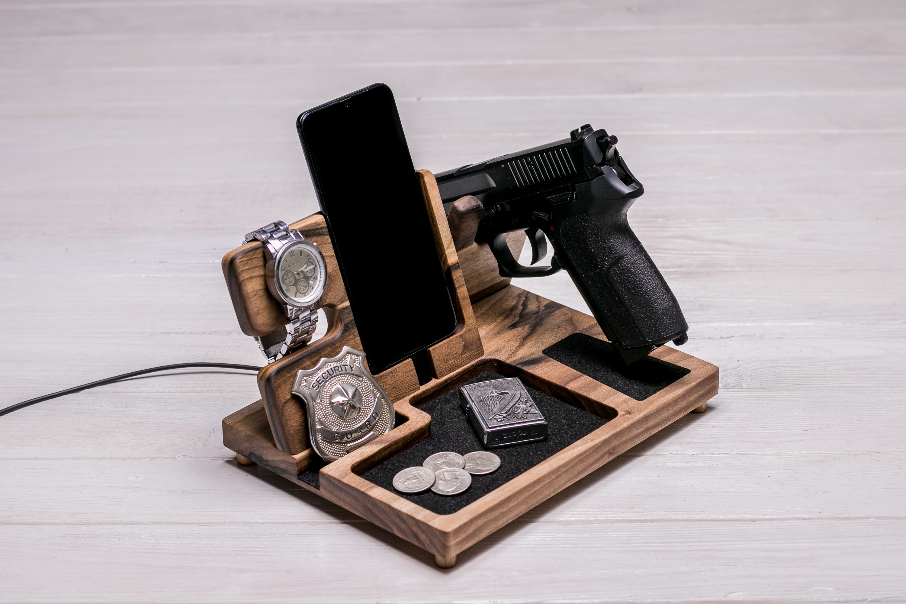 Скажіть "ні" хованням зброї в карман чи під стіл! Якщо у вас є пістолет – гордо розміщуйте його на столі, а саме на нашому новому дерев'яному органайзері для пістолета. Цей органайзер не лише для пістолета! У ньому знайдеться місце і для телефона, годинників, ручок та візиток.