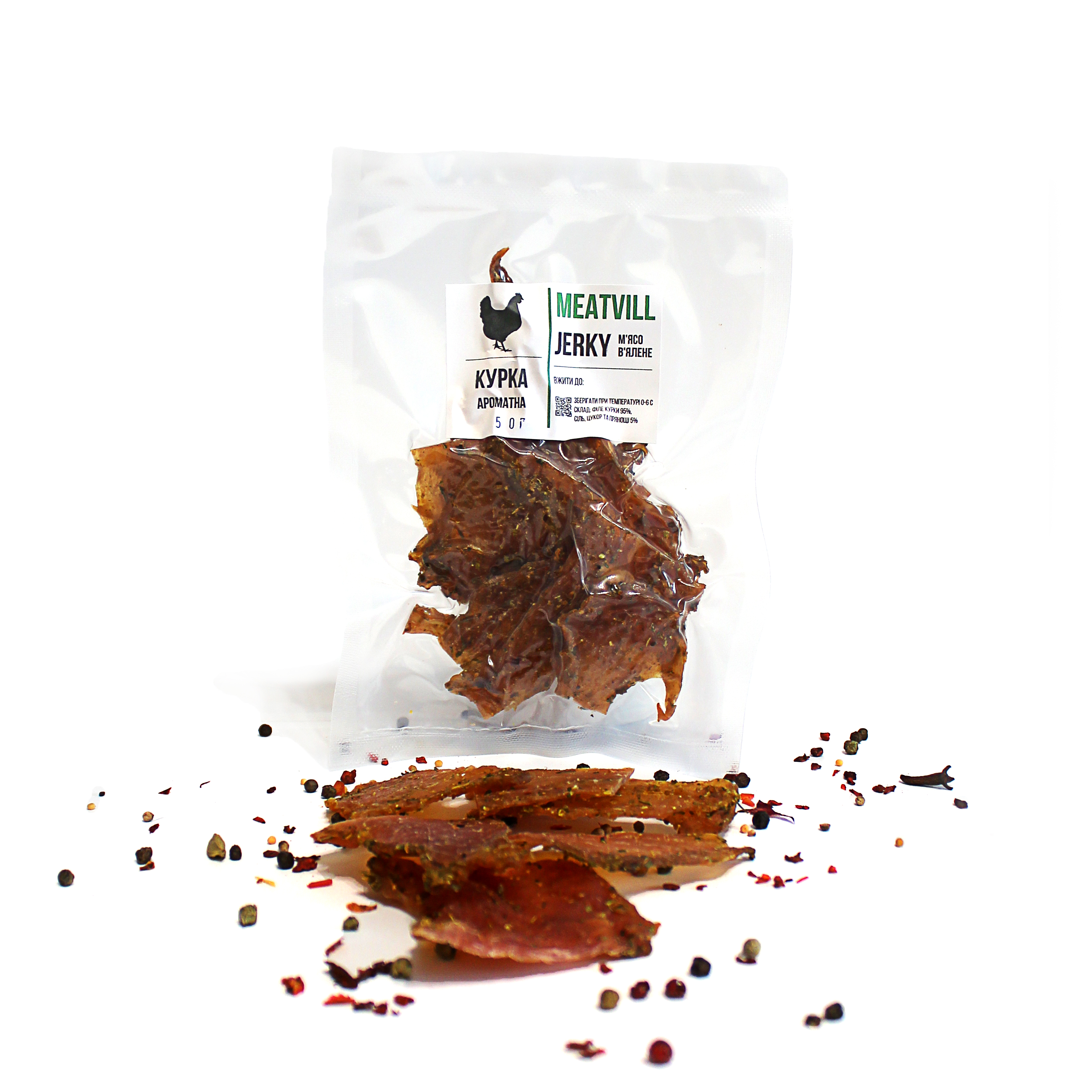 Спробуйте джерки ароматні MEATVILL Курка і насолоджуйтеся неповторним смаком, який поєднує в собі кращі натуральні інгредієнти для вашого задоволення!