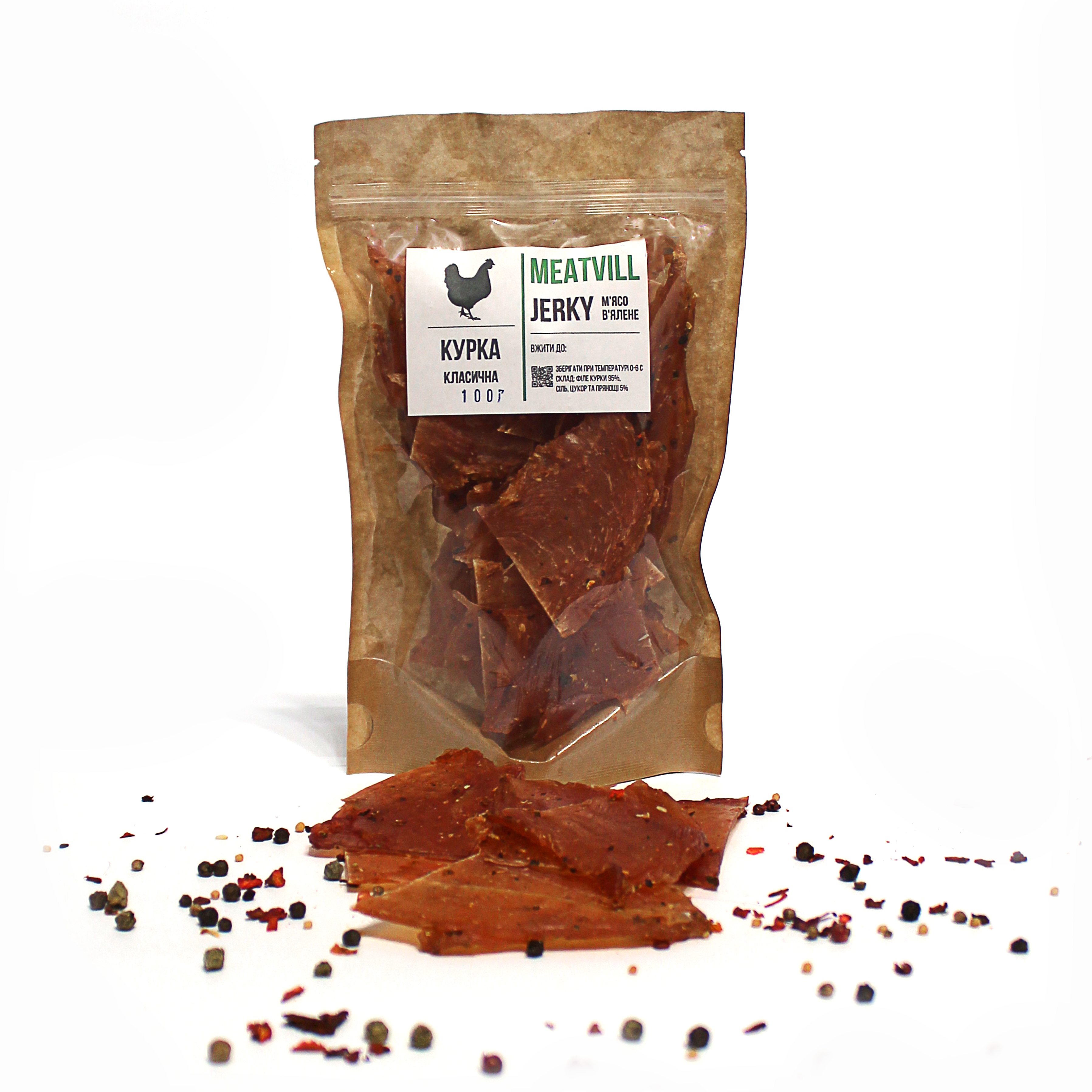 Енергетична цінність може відрізнятися від зазначеної. Оберіть джерки класичні MEATVILL Курка — смакуйте натуральність у кожному шматочку!